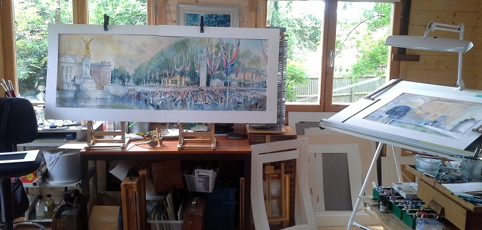 Mike's painting spans from Buckingham Palace to Admiralty Arch, capturing a panaramic view of the day