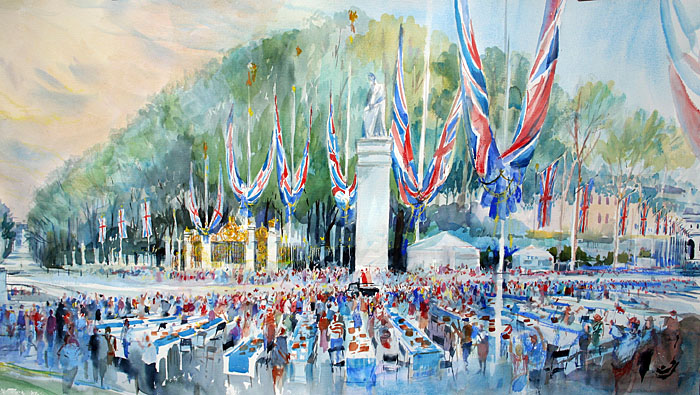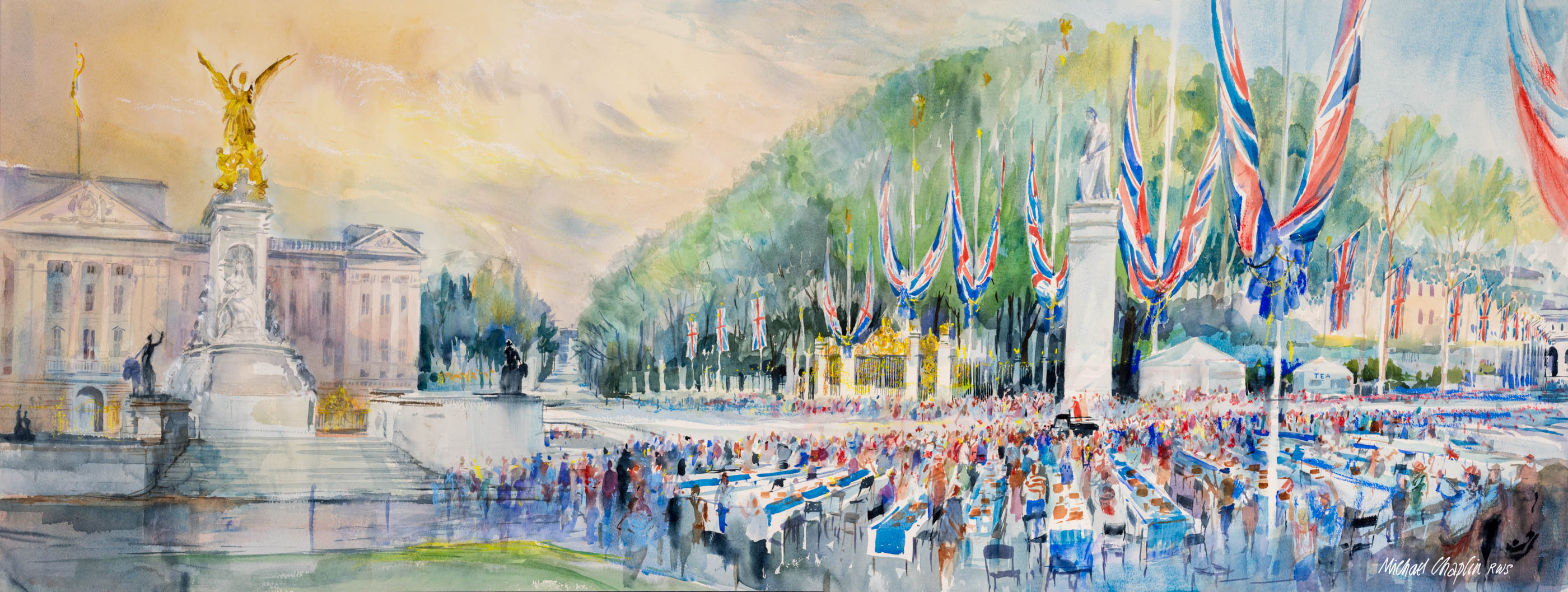 On June 12 2016, Mike was honoured to be asked to create a painting celebrating the Queen's patronage of over 600 societies. 10,000 people attended a giant street party, outside Buckingham Palace, with the Royal Family in attendance. Dispite severe rain for most of the morning, Mike attempted a 5' by 2' watercolour painting to capture the excitement of the event.