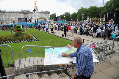 Mike painting at the Mall, capturing the spirit of the royal street party.